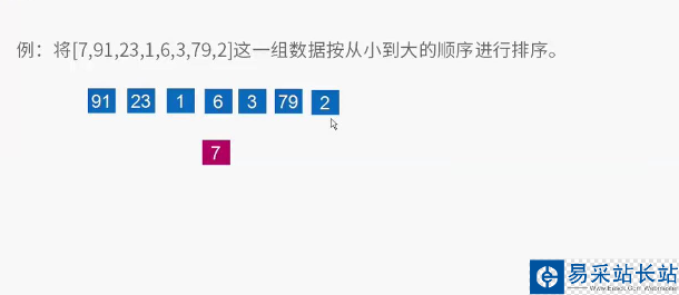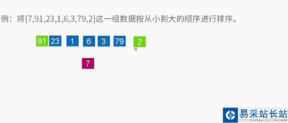 8、j指針與基準數據7比較,其中79比7大,所以將79排到右邊,此時是同側移動,所以下一個比較的是j指針對應的數據。
