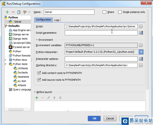 在左側目錄中將會出現(xiàn)兩個節(jié)點:Python和Default。在第一個節(jié)點目錄下有一個單一的配置選項'Solver',在第二個選項下則有很多配置信息。