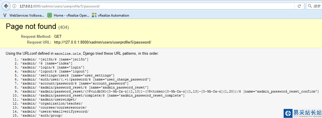 2. 在xadmin后臺頁面點擊右上角修改密碼時,會報錯