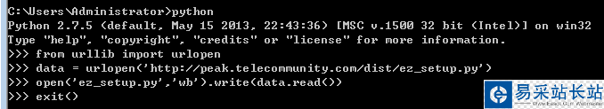from urllib import urlopendata = urlopen('http://peak.telecommunity.com/dist/ez_setup.py')open('ez_setup.py','wb').write(data.read())exit()執行完畢后可以發現在C:/Users/Administrator目錄下出現了一個ez_setup.py的文件,cmd執行python ez_setup.py,則安裝setuptools完畢