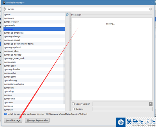 到了上面這一步,應該可以看到一個庫的列表,里面列舉著一些你常用的已安裝庫。接下來點擊,右側的一個綠色加號。打開一個Available Packages的窗口,搜索關鍵字pymongo。找到相關的庫,選中,然后點擊窗口最左下方的install package安裝即可。