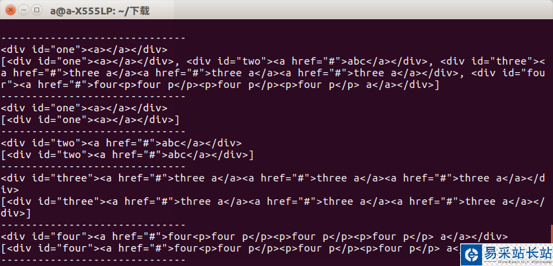 from bs4 import BeautifulSoupimport lxmlif __name__=='__main__': s = BeautifulSoup(open('test.html'),'lxml') print s.prettify() print "------------------------------" print s.find('div') print s.find_all('div') print "------------------------------" print s.find('div',id='one') print s.find_all('div',id='one') print "------------------------------" print s.find('div',id="two") print s.find_all('div',id="two") print "------------------------------" print s.find('div',id="three") print s.find_all('div',id="three") print "------------------------------" print s.find('div',id="four") print s.find_all('div',id="four") print "------------------------------"運行以后我們可以看到結果當獲取指定標簽時候兩者區別不大當獲取一組標簽的時候兩者的區別就會顯示出來