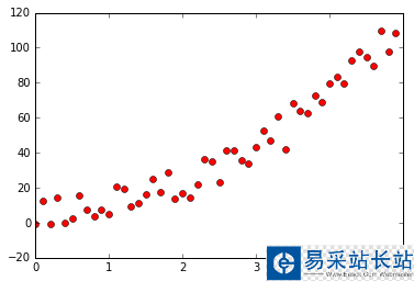 import numpy as np import matplotlib.pyplot as plt# y = 2 + 3x + 4x^2X = np.arange(0, 5, 0.1) Z = [2 + 3 * x + 4 * x ** 2 for x in X] Y = np.array([np.random.normal(z,3) for z in Z])plt.plot(X, Y, 'ro') plt.show()