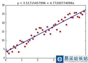 # 生成擬合直線的繪制點_X = [0, 5] _Y = [a0 + a1 * x for x in _X]plt.plot(X, Y, 'ro', _X, _Y, 'b', linewidth=2) plt.title("y = {} + {}x".format(a0, a1)) plt.show() 擬合效果如下: