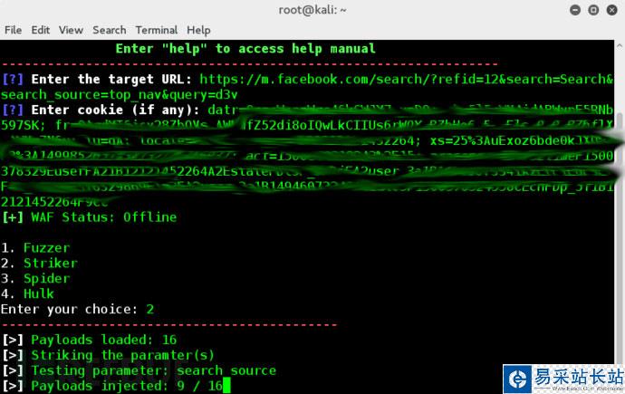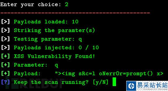 鍵入目標URL之后,XSStrike將檢測該目標是否有WAF保護,如果不受WAF保護你將看到下面4個選項