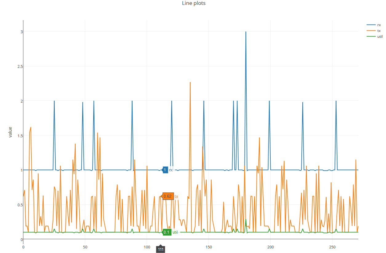 #!/usr/bin/env pythonimport plotly.offline as pltoffimport plotly.graph_objs as godef line_plots(name="line_plots.html"): dataset = { 'time': [], 'rx': [], 'tx': [], 'util': [] } with open("./log.txt") as f: i = 0 for line in f: items = line.split() dataset['time'].append(i) dataset['rx'].append(items[0]) dataset['tx'].append(items[1]) dataset['util'].append(items[2]) i += 1 data_g = [] # 構建 time - rx 數據關系,折線圖 tr_rx = go.Scatter( x = dataset['time'], y = dataset['rx'], name = 'rx') data_g.append(tr_rx) tr_tx = go.Scatter( x = dataset['time'], y = dataset['tx'], name = 'tx') data_g.append(tr_tx) tr_util = go.Scatter( x = dataset['time'], y = dataset['util'], name = 'util') data_g.append(tr_util) # 設置圖表布局 layout = go.Layout(title="Line plots", xaxis={'title':'time'}, yaxis={'title':'value'}) fig = go.Figure(data=data_g, layout=layout) # 生成離線html pltoff.plot(fig, filename=name)if __name__=='__main__': line_plots()生成圖表如下所示 :