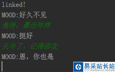 import sockets= socket.socket()host = socket.gethostname()port = 12345s.connect((host,port))print('Linked')info = ''while info != 'exit': print('SCIENCE:'+info) send_mes=input() s.send(send_mes.encode()) if send_mes =='exit': break info = s.recv(1024).decode()s.close()效果截圖:
