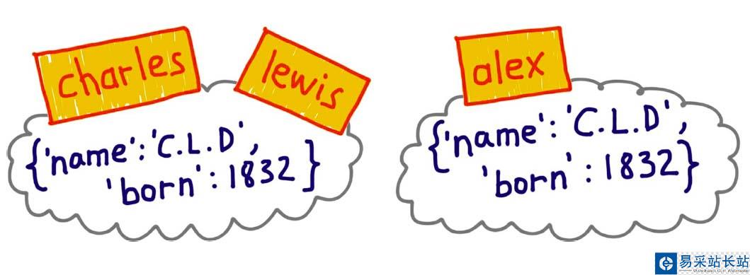 示例體現了別名。在那段代碼中,lewis 和 charles 是別名,即兩個變量綁定同一個對象。而 alex 不是 charles 的別名,因為二者綁定的是不同的對象。alex 和 charles 綁定的對象具有相同的值(== 比較的就是值),但是它們的標識不同。