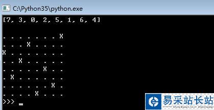 '''8皇后問題'''n = 8 x = [] # 一個解(n元數組)X = [] # 一組解# 沖突檢測:判斷 x[k] 是否與前 x[0~k-1] 沖突def conflict(k): global x for i in range(k): # 遍歷前 x[0~k-1] if x[i]==x[k] or abs(x[i]-x[k])==abs(i-k): # 判斷是否與 x[k] 沖突 return True return False# 套用子集樹模板def queens(k): # 到達第k行 global n, x, X if k >= n: # 超出最底行 #print(x) X.append(x[:]) # 保存(一個解),注意x[:] else: for i in range(n): # 遍歷第 0~n-1 列(即n個狀態) x.append(i) # 皇后置于第i列,入棧 if not conflict(k): # 剪枝 queens(k+1) x.pop() # 回溯,出棧# 解的可視化(根據一個解x,復原棋盤。'X'表示皇后)def show(x): global n for i in range(n): print('. ' * (x[i]) + 'X ' + '. '*(n-x[i]-1))# 測試queens(0) # 從第0行開始print(X[-1], '/n')show(X[-1])效果圖