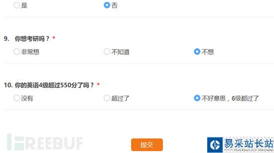 我們隨便填寫一個(gè)問(wèn)卷并提交,在提交之前開啟Burpsuite截獲數(shù)據(jù)包