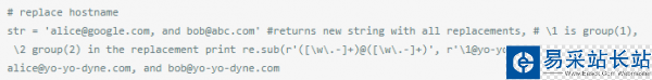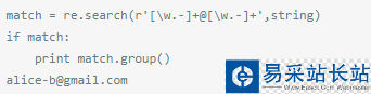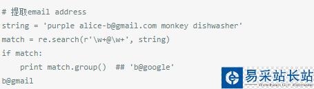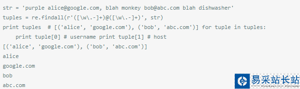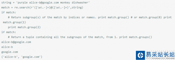 有時候需要提取匹配字符的一部分,比如剛才的郵箱,我們可能需要其中的username和hostname,這時候可以用()分別把username和hostname包起來,就像r'([/w.-]+)@([/w.-]+)',如果匹配成功,那么pattern不改變,只是可以用match.group(1)和match.group(2)來username和hostname,match.group()結果不變。