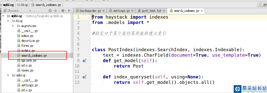 HAYSTACK_CONNECTIONS = { 'default': { # 使用whoosh引擎 'ENGINE': 'haystack.backends.whoosh_cn_backend.WhooshEngine', # 索引文件路徑 'PATH': os.path.join(BASE_DIR, 'whoosh_index'), }}# 當添加、修改、刪除數據時,自動生成索引HAYSTACK_SIGNAL_PROCESSOR = 'haystack.signals.RealtimeSignalProcessor'3. 在templates目錄下創建“search/indexes/blog/”目錄 采用blog應用名字下面創建一個文件blog_text.txt