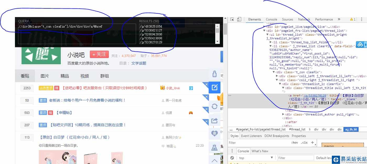 圖中的黑色方框左邊填寫xpth,右邊會返回對應的結果,可以看到當前頁面的帖子全部抓取到了。xpth具體怎么寫要根據右邊的檢查元素來具體分析,尋找規律,每個網站的方式不一樣,但是細心尋找可以找到相同的規律。
