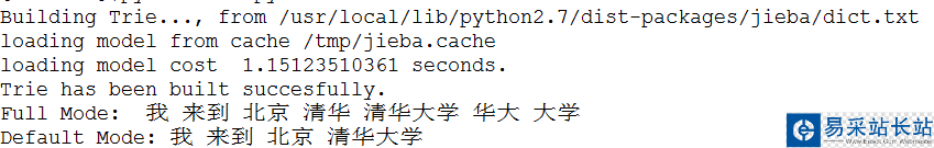 #! -*- coding:utf-8 -*-import jiebaseg_list = jieba.cut("我來到北京清華大學", cut_all = True)print "Full Mode:", ' '.join(seg_list)seg_list = jieba.cut("我來到北京清華大學")print "Default Mode:", ' '.join(seg_list)