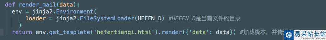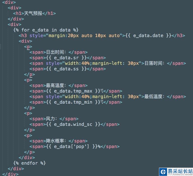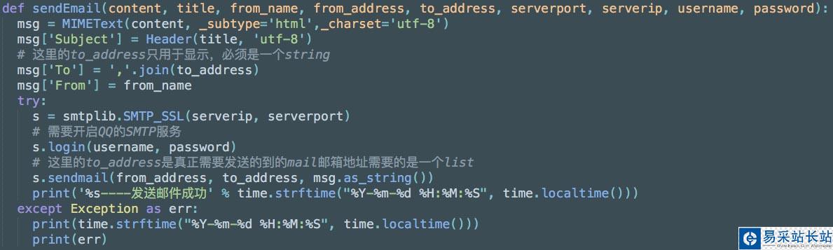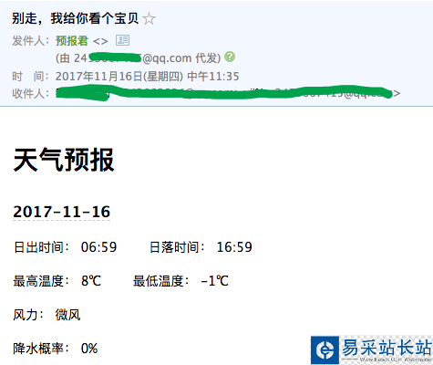 #!/usr/local/bin/python3# coding=utf-8import requestsimport jsonimport smtplibimport jinja2import os.path as pthimport timefrom email.mime.text import MIMETextfrom email.header import HeaderHEFEN_D = pth.abspath(pth.dirname(__file__))LOCATION = '北京'ORIGINAL_URL = 'https://free-api.heweather.com/s6/weather/forecast?parameters'TO = ['8*******@qq.com', '2********@qq.com']def sendEmail(content, title, from_name, from_address, to_address, serverport, serverip, username, password): msg = MIMEText(content, _subtype='html',_charset='utf-8') msg['Subject'] = Header(title, 'utf-8') # 這里的to_address只用于顯示,必須是一個string msg['To'] = ','.join(to_address) msg['From'] = from_name try:  s = smtplib.SMTP_SSL(serverip, serverport)  s.login(username, password)  # 這里的to_address是真正需要發送的到的mail郵箱地址需要的是一個list  s.sendmail(from_address, to_address, msg.as_string())  print('%s----發送郵件成功' % time.strftime("%Y-%m-%d %H:%M:%S", time.localtime())) except Exception as err:  print(time.strftime("%Y-%m-%d %H:%M:%S", time.localtime()))  print(err)def get_data(): new_data = [] parametres = {  'location': LOCATION,  'key': '************ ', #注冊和風天氣會給你一個KEY  'lang': 'zh',  'unit': 'm' } try:  response = requests.get(ORIGINAL_URL,params=parametres)  r = json.loads(json.dumps(response.text,ensure_ascii=False,indent=1))  r = json.loads(response.text) except Exception as err:  print(err) weather_forecast = r['HeWeather6'][0]['daily_forecast'] for data in weather_forecast:  new_obj = {}  # 日期  new_obj['date'] = data['date']  # 日出時間  new_obj['sr'] = data['sr']  # 日落時間  new_obj['ss'] = data['ss']  # 最高溫度  new_obj['tmp_max'] = data['tmp_max']  # 最低溫度  new_obj['tmp_min'] = data['tmp_min']  # 白天天氣狀況描述  new_obj['cond_txt_d'] = data['cond_txt_d']  # 風向  new_obj['wind_dir'] = data['wind_dir']  # 風力  new_obj['wind_sc'] = data['wind_sc']  # 降水概率  new_obj['pop'] = data['pop']  # 能見度  new_obj['vis'] = data['vis']  new_data.append(new_obj) return new_datadef render_mail(data): env = jinja2.Environment(   loader = jinja2.FileSystemLoader(HEFEN_D)  ) return env.get_template('hefentianqi.html').render({'data': data})def main(): config = { "from": "2********@qq.com", "from_name": '預報君', "to": TO, "serverip": "smtp.qq.com", "serverport": "465", "username": "2*******@qq.com", "password": "**********" #QQ郵箱的SMTP授權碼 } title = "別走,我給你看個寶貝" data = get_data() body = render_mail(data) sendEmail(body, title, config['from_name'], config['from'], config['to'], config['serverport'], config['serverip'], config['username'], config['password'])main()