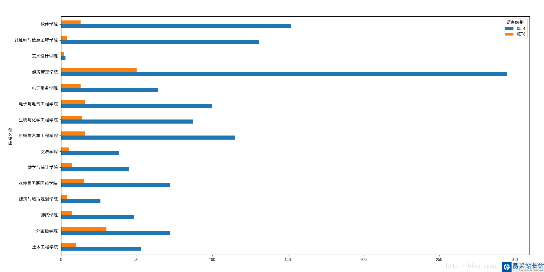 #按照各個學院進行分組xymean = sj['總分'].groupby([sj['院系名稱'],sj['語言級別']])#計算各個學院的平均分數xymean = xymean.mean()