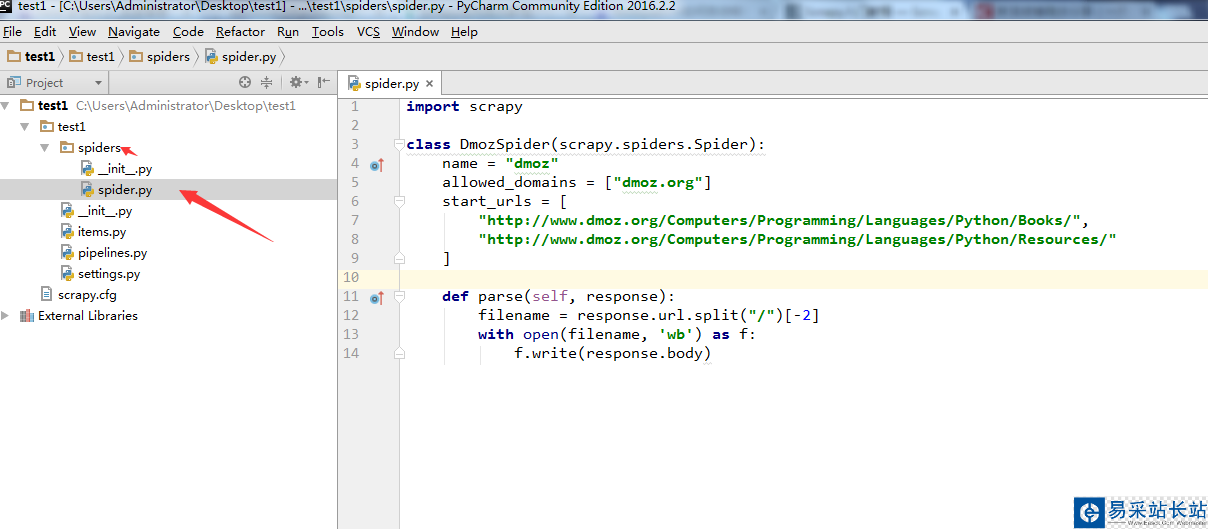在test1/spiders/,文件夾下,新建一個爬蟲spider.py, 注意代碼中的name="dmoz"。這個名字后面會用到。
