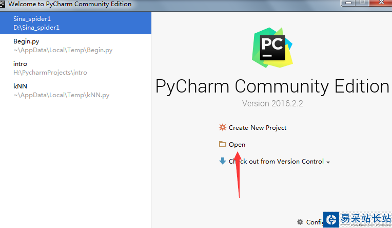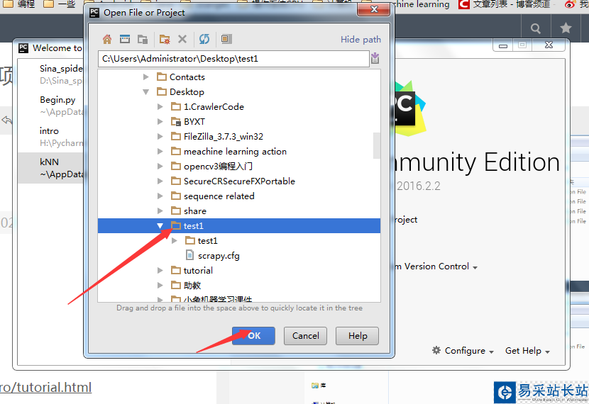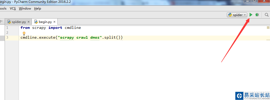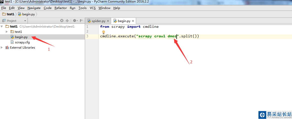 在test1目錄和scrapy.cfg同級目錄下面,新建一個begin.py文件(便于理解可以寫成main.py),注意箭頭2所指的名字和第5步中的name='dmoz'名字是一樣的。