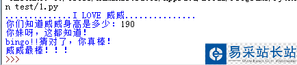 print('..............I LOVE 威威...............')tall = input("你們知道威威身高是多少:") guess = int(tall) #將tall強制轉型賦值給guessif guess == 190: #判斷 print("你妹呀,這都知道!") print("bingo!!猜對了,你真棒!")else: print("真笨,不想和你玩了,再見。")print("威威最棒!?。?)結果: