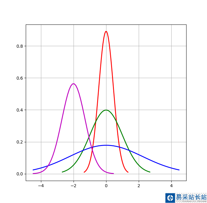 # Python實(shí)現(xiàn)正態(tài)分布 # 繪制正態(tài)分布概率密度函數(shù) u = 0 # 均值μ u01 = -2 sig = math.sqrt(0.2) # 標(biāo)準(zhǔn)差δ sig01 = math.sqrt(1) sig02 = math.sqrt(5) sig_u01 = math.sqrt(0.5) x = np.linspace(u - 3*sig, u + 3*sig, 50) x_01 = np.linspace(u - 6 * sig, u + 6 * sig, 50) x_02 = np.linspace(u - 10 * sig, u + 10 * sig, 50) x_u01 = np.linspace(u - 10 * sig, u + 1 * sig, 50) y_sig = np.exp(-(x - u) ** 2 /(2* sig **2))/(math.sqrt(2*math.pi)*sig) y_sig01 = np.exp(-(x_01 - u) ** 2 /(2* sig01 **2))/(math.sqrt(2*math.pi)*sig01) y_sig02 = np.exp(-(x_02 - u) ** 2 / (2 * sig02 ** 2)) / (math.sqrt(2 * math.pi) * sig02) y_sig_u01 = np.exp(-(x_u01 - u01) ** 2 / (2 * sig_u01 ** 2)) / (math.sqrt(2 * math.pi) * sig_u01) plt.plot(x, y_sig, "r-", linewidth=2) plt.plot(x_01, y_sig01, "g-", linewidth=2) plt.plot(x_02, y_sig02, "b-", linewidth=2) plt.plot(x_u01, y_sig_u01, "m-", linewidth=2) # plt.plot(x, y, 'r-', x, y, 'go', linewidth=2,markersize=8) plt.grid(True) plt.show()