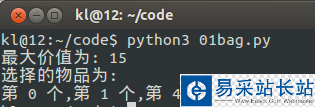 def bag(n,c,w,v):  res=[[-1 for j in range(c+1)] for i in range(n+1)]  for j in range(c+1):    res[0][j]=0  for i in range(1,n+1):    for j in range(1,c+1):      res[i][j]=res[i-1][j]      if j>=w[i-1] and res[i][j]<res[i-1][j-w[i-1]]+v[i-1]:        res[i][j]=res[i-1][j-w[i-1]]+v[i-1]  return resdef show(n,c,w,res):  print('最大價值為:',res[n][c])  x=[False for i in range(n)]  j=c  for i in range(1,n+1):    if res[i][j]>res[i-1][j]:      x[i-1]=True      j-=w[i-1]  print('選擇的物品為:')  for i in range(n):    if x[i]:      print('第',i,'個,',end='')  print('')if __name__=='__main__':  n=5  c=10  w=[2,2,6,5,4]  v=[6,3,5,4,6]  res=bag(n,c,w,v)  show(n,c,w,res)輸出結果如下: