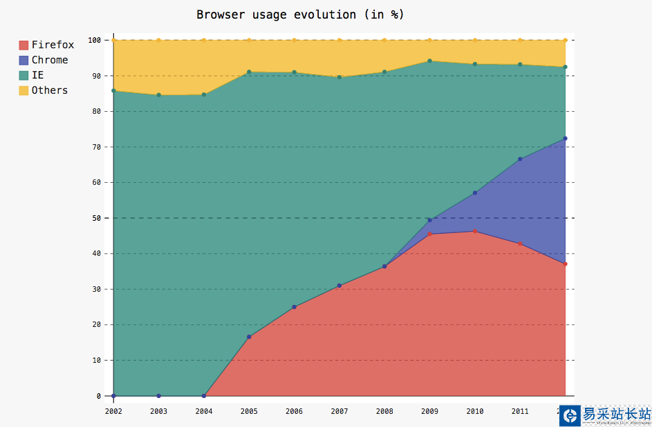 line_chart = pygal.StackedLine(fill=True)line_chart.title = 'Browser usage evolution (in %)'line_chart.x_labels = map(str, range(2002, 2013))line_chart.add('Firefox', [None, None, 0, 16.6,  25,  31, 36.4, 45.5, 46.3, 42.8, 37.1])line_chart.add('Chrome', [None, None, None, None, None, None,  0, 3.9, 10.8, 23.8, 35.3])line_chart.add('IE',   [85.8, 84.6, 84.7, 74.5,  66, 58.6, 54.7, 44.8, 36.2, 26.6, 20.1])line_chart.add('Others', [14.2, 15.4, 15.3, 8.9,  9, 10.4, 8.9, 5.8, 6.7, 6.8, 7.5])line_chart.render_to_file('bar_chart.svg')