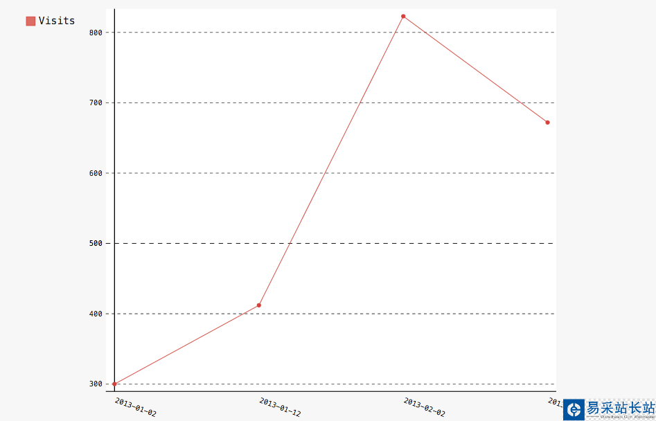 from datetime import datetimedate_chart = pygal.Line(x_label_rotation=20)date_chart.x_labels = map(lambda d: d.strftime('%Y-%m-%d'), [ datetime(2013, 1, 2), datetime(2013, 1, 12), datetime(2013, 2, 2), datetime(2013, 2, 22)])date_chart.add("Visits", [300, 412, 823, 672])date_chart.render_to_file('bar_chart.svg')