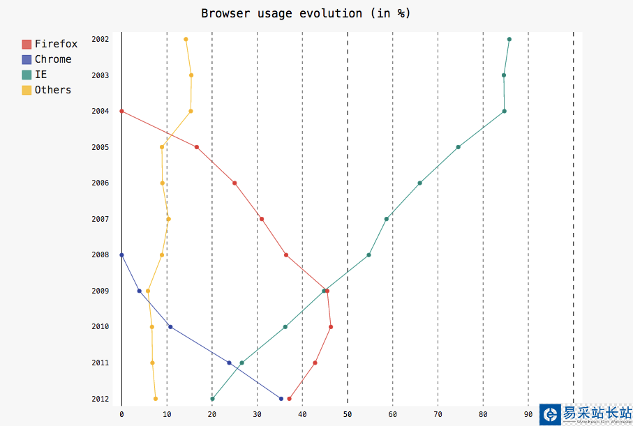 line_chart = pygal.HorizontalLine()line_chart.title = 'Browser usage evolution (in %)'line_chart.x_labels = map(str, range(2002, 2013))line_chart.add('Firefox', [None, None,  0, 16.6,  25,  31, 36.4, 45.5, 46.3, 42.8, 37.1])line_chart.add('Chrome', [None, None, None, None, None, None,  0, 3.9, 10.8, 23.8, 35.3])line_chart.add('IE',   [85.8, 84.6, 84.7, 74.5,  66, 58.6, 54.7, 44.8, 36.2, 26.6, 20.1])line_chart.add('Others', [14.2, 15.4, 15.3, 8.9,  9, 10.4, 8.9, 5.8, 6.7, 6.8, 7.5])line_chart.range = [0, 100]line_chart.render_to_file('bar_chart.svg')