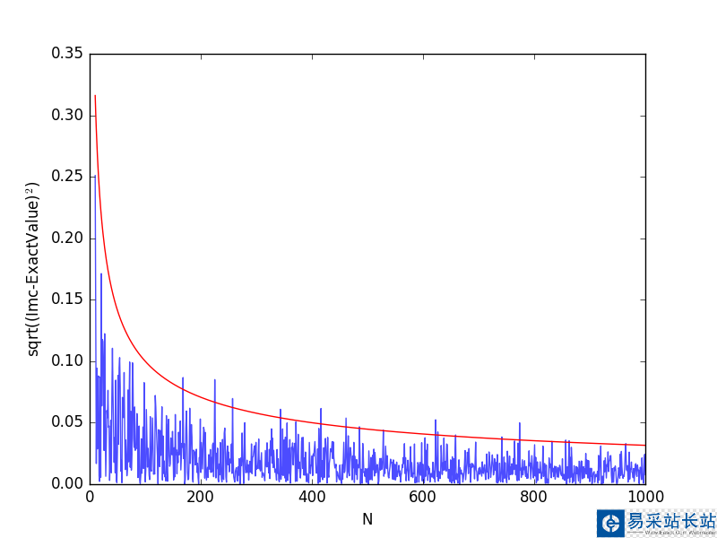 # -*- coding: utf-8 -*-import numpy as npimport matplotlib.pyplot as pltdef f(x):  return x**2 + 4*x*np.sin(x) def intf(x):   return x**3/3.0+4.0*np.sin(x) - 4.0*x*np.cos(x)a = 2;  b = 3; # use N draws N= 10000X = np.random.uniform(low=a, high=b, size=N) # N values uniformly drawn from a to b Y =f(X)  # CALCULATE THE f(x) # 蒙特卡洛法計算定積分:面積=寬度*平均高度Imc= (b-a) * np.sum(Y)/ N;exactval=intf(b)-intf(a)print "Monte Carlo estimation=",Imc, "Exact number=", intf(b)-intf(a)# --How does the accuracy depends on the number of points(samples)? Lets try the same 1-D integral # The Monte Carlo methods yield approximate answers whose accuracy depends on the number of draws.Imc=np.zeros(1000)Na = np.linspace(0,1000,1000)exactval= intf(b)-intf(a)for N in np.arange(0,1000):  X = np.random.uniform(low=a, high=b, size=N) # N values uniformly drawn from a to b   Y =f(X)  # CALCULATE THE f(x)   Imc[N]= (b-a) * np.sum(Y)/ N;   plt.plot(Na[10:],np.sqrt((Imc[10:]-exactval)**2), alpha=0.7)plt.plot(Na[10:], 1/np.sqrt(Na[10:]), 'r')plt.xlabel("N")plt.ylabel("sqrt((Imc-ExactValue)$^2$)")plt.show()>>>