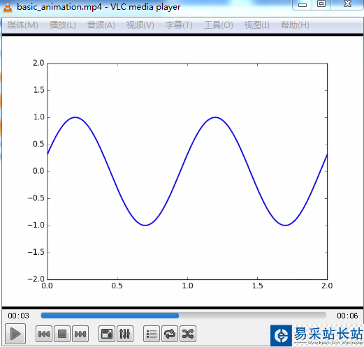 """A simple example of an animated plot"""import numpy as npfrom matplotlib import pyplot as pltfrom matplotlib import animation# First set up the figure, the axis, and the plot element we want to animatefig = plt.figure()# create our line object which will be modified in the animationax = plt.axes(xlim=(0, 2), ylim=(-2, 2))# we simply plot an empty line: we'll add data to the line laterline, = ax.plot([], [], lw=2) # initialization function: plot the background of each framedef init(): line.set_data([], []) return line,# animation function. This is called sequentially# It takes a single parameter, the frame number i def animate(i): x = np.linspace(0, 2, 1000) y = np.sin(2 * np.pi * (x - 0.01 * i)) # update the data line.set_data(x, y) return line,# Makes an animation by repeatedly calling a function func# frames can be a generator, an iterable, or a number of frames.# interval draws a new frame every interval milliseconds.# blit=True means only re-draw the parts that have changed.# 在這里設置一個200幀的動畫,每幀之間間隔20毫秒anim = animation.FuncAnimation(fig, animate, init_func=init,        frames=200, interval=20, blit=True)# save the animation as an mp4. This requires ffmpeg or mencoder to be# installed. The extra_args ensure that the x264 codec is used, so that# the video can be embedded in html5. You may need to adjust this for# your system: for more information, see# http://matplotlib.sourceforge.net/api/animation_api.htmlanim.save('basic_animation.mp4', fps=30, extra_args=['-vcodec', 'libx264'])plt.show() # plt.show() 會一直循環播放動畫結果: