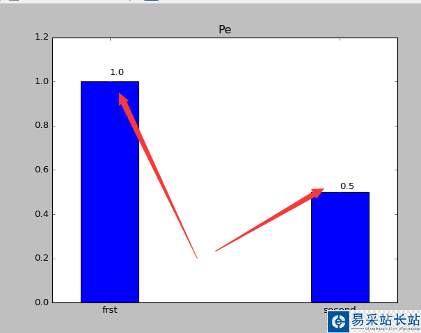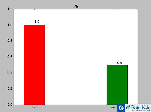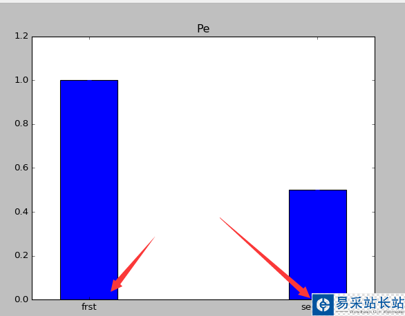 import numpy as npimport matplotlib.pyplot as pltfrom matplotlib import mlabfrom matplotlib import rcParamsfig1 = plt.figure(2)rects =plt.bar(left = (0.2,1),height = (1,0.5),width = 0.2,align="center",yerr=0.000001)plt.title('Pe')plt.xticks((0.2,1),('frst','second'))plt.show()