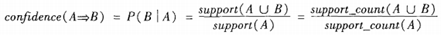 其中 表示事務包含集合A和B的并(即包含A和B中的每個項)的概率。注意與P(A or B)區別,后者表示事務包含A或B的概率。
