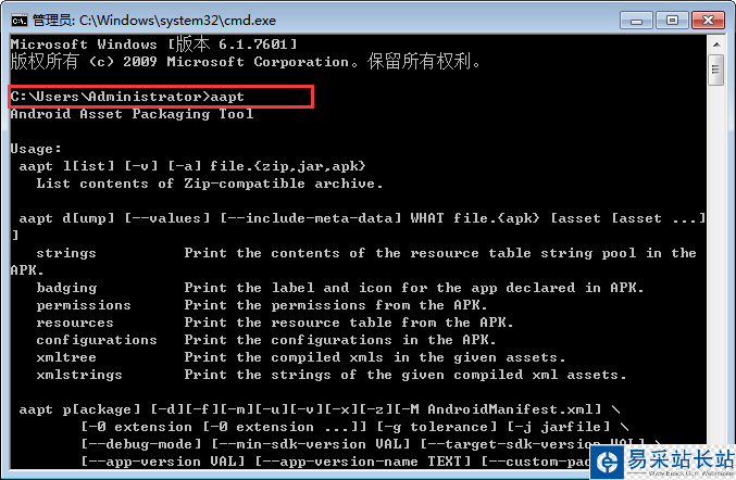 4.打開cmd,輸入aapt出現如下界面,說明環境OK了