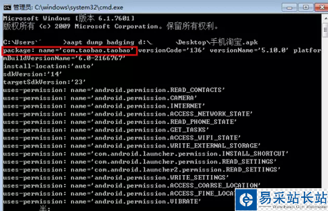 2.打開cmd,輸入指令aapt dump badging D:/test/xxx.apk