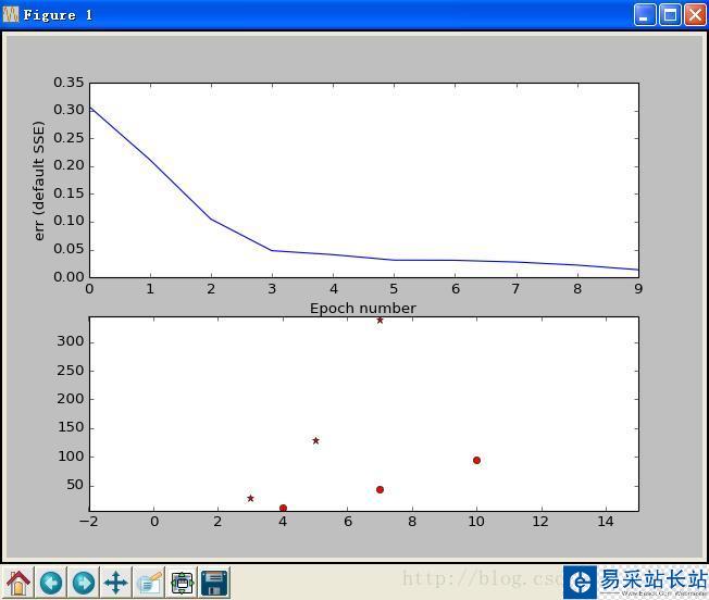 import numpy as np import matplotlib.pyplot as plt import neurolab as nl input = np.array([[4,11],[7,340],[10,95],[3,29],[7,43],[5,128]]) target=np.array([[1],[0],[1],[0],[1],[0]]) #2層網絡,5個輸入節點,一個輸出節點 net=nl.net.newff([[3,10],[11,400]],[5,1]) err=net.train(input,target,epochs=500, show=1, goal=0.02) out=net.sim(input) mymean=np.mean(out) x_max=np.max(input[:,0])+5 x_min=np.min(input[:,0])-5 y_max=np.max(input[:,1])+5 y_min=np.min(input[:,1])-5 plt.subplot(211) #誤差曲線 plt.plot(range(len(err)),err) plt.xlabel('Epoch number') plt.ylabel('err (default SSE)') plt.subplot(212) #可視化圖 plt.xlim(x_min,x_max) plt.ylim(y_min,y_max) for i in xrange(0,len(input)):  if out[i]>mymean:   plt.plot(input[i,0],input[i,1],'ro')  else:   plt.plot(input[i,0],input[i,1],'r*')  plt.show()