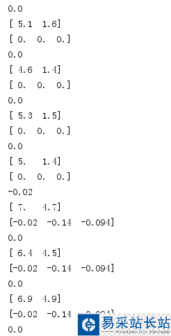 # -*- coding: utf-8 -*-import numpy as npclass Perceptron(object): """ eta:學習率 n_iter:權重向量的訓練次數 w_:神經分叉權重向量 errors_:用于記錄神經元判斷出錯次數 """ def __init__(self, eta=0.01, n_iter=2):  self.eta = eta  self.n_iter = n_iter  pass def fit(self, X, y):  """  輸入訓練數據培訓神經元  X:神經元輸入樣本向量  y: 對應樣本分類  X:shape[n_samples,n_features]  x:[[1,2,3],[4,5,6]]  n_samples = 2 元素個數  n_features = 3 子向量元素個數  y:[1,-1]  初始化權重向量為0  加一是因為前面算法提到的w0,也就是步調函數閾值  """  self.w_ = np.zeros(1 + X.shape[1])  self.errors_ = []  for _ in range(self.n_iter):   errors = 0   """   zip(X,y) = [[1,2,3,1],[4,5,6,-1]]   xi是前面的[1,2,3]   target是后面的1   """   for xi, target in zip(X, y):    """    predict(xi)是計算出來的分類    """    update = self.eta * (target - self.predict(xi))    self.w_[1:] += update * xi    self.w_[0] += update    print update    print xi    print self.w_    errors += int(update != 0.0)    self.errors_.append(errors)    pass def net_input(self, X):  """  z = w0*1+w1*x1+....Wn*Xn  """  return np.dot(X, self.w_[1:]) + self.w_[0] def predict(self, X):  return np.where(self.net_input(X) >= 0, 1, -1)if __name__ == '__main__': datafile = '../data/iris.data.csv' import pandas as pd df = pd.read_csv(datafile, header=None) import matplotlib.pyplot as plt import numpy as np y = df.loc[0:100, 4].values y = np.where(y == "Iris-setosa", 1, -1) X = df.iloc[0:100, [0, 2]].values # plt.scatter(X[:50, 0], X[:50, 1], color="red", marker='o', label='setosa') # plt.scatter(X[50:100, 0], X[50:100, 1], color="blue", marker='x', label='versicolor') # plt.xlabel("hblength") # plt.ylabel("hjlength") # plt.legend(loc='upper left') # plt.show() pr = Perceptron() pr.fit(X, y)其中數據為