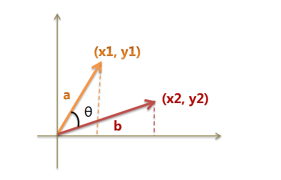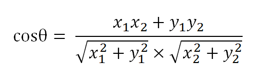 假定a向量是[x1, y1],b向量是[x2, y2],那么可以將余弦定理改寫成下面的形式: