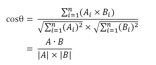數(shù)學(xué)家已經(jīng)證明,余弦的這種計(jì)算方法對(duì)n維向量也成立。假定A和B是兩個(gè)n維向量,A是 [A1, A2, ..., An] ,B是 [B1, B2, ..., Bn] ,則A與B的夾角θ的余弦等于: