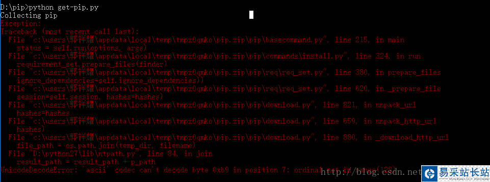 pip實際上一款比較方便的在線軟件安裝工具,類似于easy install,我們現在安裝pip,在之后的軟件安裝的時候我們就可以使用 pip install 命令了。首先我們要下載get-pip.py(get-pip.py文件) ,下載完成之后,我們在cmd下進行安裝,首先切換到文件所在目錄,然后輸入python get-pip.py語句,便可以進行安裝了,但是最頭疼的問題出現了,由于該文件會將一些配置文件自動寫入到我們的C盤用戶文件目錄下,而我的用戶目錄是中文名,就會產生編碼異常。