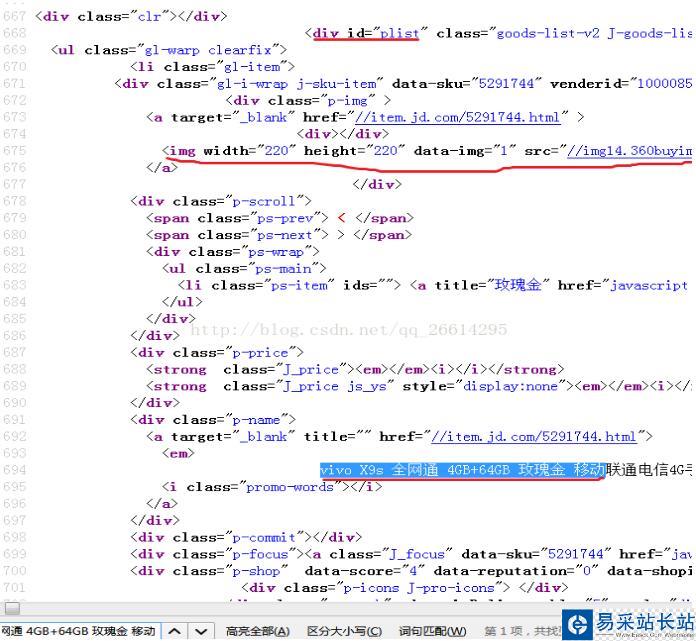 我們使用在源代碼的頁面使用ctrl+f查找,然后在查找框里面輸入頁面第一臺手機的名字 “vivo X9s 全網通 4GB+64GB 玫瑰金 移動” 快速定位到圖片鏈接附近的代碼,便于后面編程對圖片范圍進行篩選