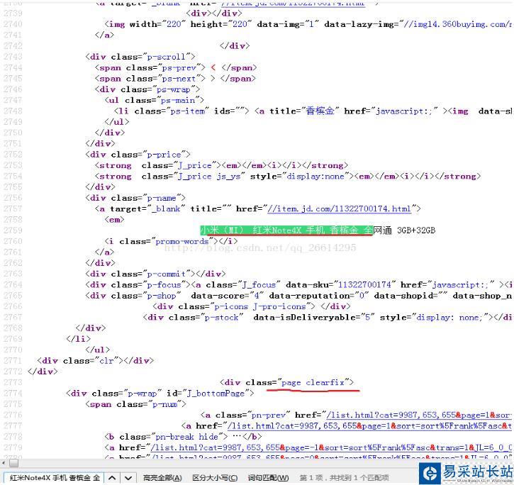 接著我們要找到這個頁面最后一張手機圖片的位置,方便找出可以作為篩選頁面的結束位置,方法和上面類似,在源代碼搜索框輸入 小米(MI) 紅米Note4X 手機 香檳金 全網通 3GB+32GB 定位到頁面最后一張圖片位置