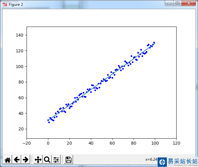 import numpy as npimport matplotlib.pyplot as pltimport randomclass dataMinning:  datasets = []  labelsets = []    addressD = '' #Data folder  addressL = '' #Label folder    npDatasets = np.zeros(1)  npLabelsets = np.zeros(1)    cost = []  numIterations = 0  alpha = 0  theta = np.ones(2)  #pCols = 0  #dRows = 0  def __init__(self,addressD,addressL,theta,numIterations,alpha,datasets=None):    if datasets is None:      self.datasets = []    else:      self.datasets = datasets    self.addressD = addressD    self.addressL = addressL    self.theta = theta    self.numIterations = numIterations    self.alpha = alpha      def readFrom(self):    fd = open(self.addressD,'r')    for line in fd:      tmp = line[:-1].split()      self.datasets.append([int(i) for i in tmp])    fd.close()    self.npDatasets = np.array(self.datasets)    fl = open(self.addressL,'r')    for line in fl:      tmp = line[:-1].split()      self.labelsets.append([int(i) for i in tmp])    fl.close()        tm = []    for item in self.labelsets:      tm = tm + item    self.npLabelsets = np.array(tm)  def genData(self,numPoints,bias,variance):    self.genx = np.zeros(shape = (numPoints,2))    self.geny = np.zeros(shape = numPoints)    for i in range(0,numPoints):      self.genx[i][0] = 1      self.genx[i][1] = i      self.geny[i] = (i + bias) + random.uniform(0,1) * variance  def gradientDescent(self):    xTrans = self.genx.transpose() #    i = 0    while i < self.numIterations:      hypothesis = np.dot(self.genx,self.theta)      loss = hypothesis - self.geny      #record the cost      self.cost.append(np.sum(loss ** 2))      #calculate the gradient      gradient = np.dot(xTrans,loss)      #updata, gradientDescent      self.theta = self.theta - self.alpha * gradient      i = i + 1          def show(self):    print 'yes'    if __name__ == "__main__":  c = dataMinning('c://city.txt','c://st.txt',np.ones(2),100000,0.000005)  c.genData(100,25,10)  c.gradientDescent()  cx = range(len(c.cost))  plt.figure(1)  plt.plot(cx,c.cost)  plt.ylim(0,25000)  plt.figure(2)  plt.plot(c.genx[:,1],c.geny,'b.')  x = np.arange(0,100,0.1)  y = x * c.theta[1] + c.theta[0]  plt.plot(x,y)  plt.margins(0.2)  plt.show()