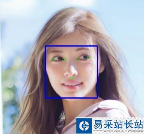 # dlib人臉關鍵點檢測器  predictor_path = "shape_predictor_5_face_landmarks.dat"  predictor = dlib.shape_predictor(predictor_path)   # dlib正臉檢測器  detector = dlib.get_frontal_face_detector()  # 正臉檢測  dets = detector(img, 1)  # 如果檢測到人臉  if len(dets)>0:     for d in dets:      x,y,w,h = d.left(),d.top(), d.right()-d.left(), d.bottom()-d.top()      # x,y,w,h = faceRect       cv2.rectangle(img,(x,y),(x+w,y+h),(255,0,0),2,8,0)      # 關鍵點檢測,5個關鍵點      shape = predictor(img, d)      for point in shape.parts():        cv2.circle(img,(point.x,point.y),3,color=(0,255,0))      cv2.imshow("image",img)      cv2.waitKey() 這部分效果如下圖: