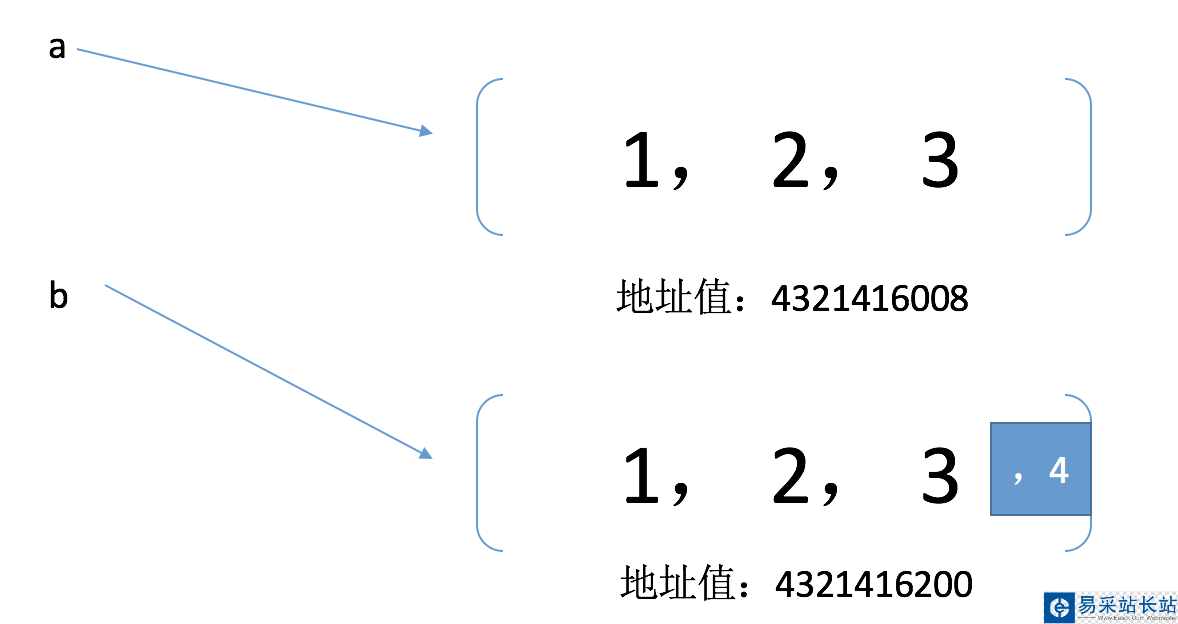 a = [1, 2, 3]print('a = %s' % a) # a = [1, 2, 3]b = aprint('b = %s' % b) # b = [1, 2, 3]a.append(4) # 對a進行修改print('a = %s' % a) # a = [1, 2, 3, 4]print('b = %s' % b) # b = [1, 2, 3, 4]b.append(5) # 對b進行修改print('a = %s' % a) # a = [1, 2, 3, 4, 5]print('b = %s' % b) # b = [1, 2, 3, 4, 5]上面的代碼比較簡單,定義了一個變量a,它是一個數值[1, 2, 3]的列表,通過一個簡單的賦值語句 b = a 定義變量b,它同樣也是數值[1, 2, 3]的列表。