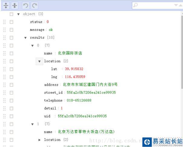 上圖是將返回的json數(shù)據(jù)解析之后的結(jié)果,可以看到,服務器返回了10條北京市的飯店的信息,包括飯店名稱、經(jīng)緯度、地址、聯(lián)系電話等。