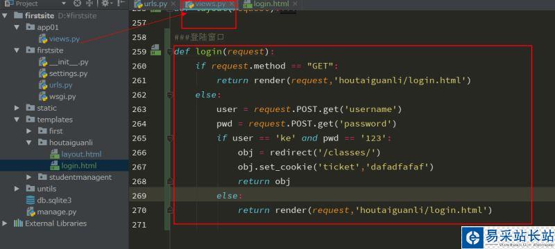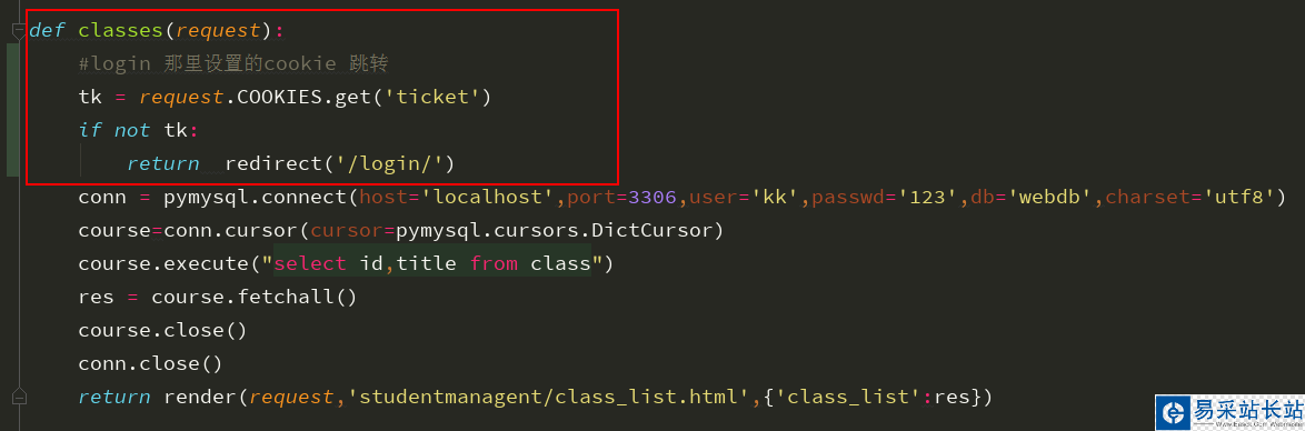 def login(request): if request.method == "GET": return render(request,'houtaiguanli/login.html') else: user = request.POST.get('username') pwd = request.POST.get('password') if user == 'ke' and pwd == '123': obj = redirect('/classes/') obj.set_cookie('ticket','dafadfafaf') return obj else: return render(request,'houtaiguanli/login.html')這里設計登錄成功后可以正常訪問班級頁面即“classes”,所以要在班級方法那里做個判斷。如果判斷為用戶已經登錄,則可以正常訪問。判斷用戶沒有正常登錄,則讓它跳轉到登錄頁面繼續登錄