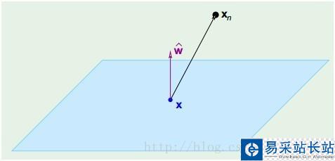 因此W垂直于超面。知道了W垂直于超面,那么Xn到超面的距離其實(shí)就是Xn和超面上任意一點(diǎn)x的連線在W上的投影,如(圖四)所示: