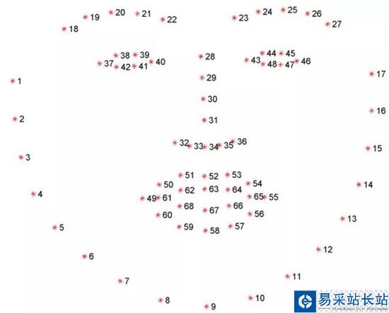 上面下載的模型數據是用來估計人臉上68個特征點(x, y)的坐標位置,這68個坐標點的位置如下圖所示