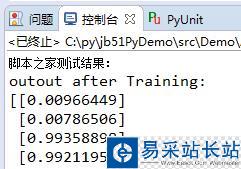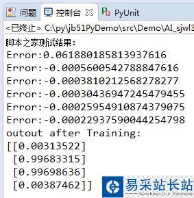 # -*- coding:utf-8 -*-#! python2import numpy as npdef nonlin(x, deriv = False): if(deriv == True): return x*(1-x) else: return 1/(1+np.exp(-x))#input datasetX = np.array([[0,0,1], [0,1,1], [1,0,1], [1,1,1]])#output datasety = np.array([[0,1,1,0]]).Tsyn0 = 2*np.random.random((3,4)) - 1 #the first-hidden layer weight valuesyn1 = 2*np.random.random((4,1)) - 1 #the hidden-output layer weight valueprint "武林站長站測試結果:"for j in range(60000): l0 = X #the first layer,and the input layer l1 = nonlin(np.dot(l0,syn0)) #the second layer,and the hidden layer l2 = nonlin(np.dot(l1,syn1)) #the third layer,and the output layer l2_error = y-l2 #the hidden-output layer error if(j%10000) == 0: print "Error:"+str(np.mean(l2_error)) l2_delta = l2_error*nonlin(l2,deriv = True) l1_error = l2_delta.dot(syn1.T) #the first-hidden layer error l1_delta = l1_error*nonlin(l1,deriv = True) syn1 += l1.T.dot(l2_delta) syn0 += l0.T.dot(l1_delta)print "outout after Training:"print l2