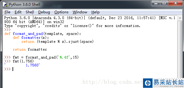 def format_and_pad(template, space):  def formatter(x):    return (template % x).rjust(space)  return formatter# 創建一個始終返回15位字符串的浮點數格式化器fmt = format_and_pad('%.4f',15)fmt(1.756)運行結果: